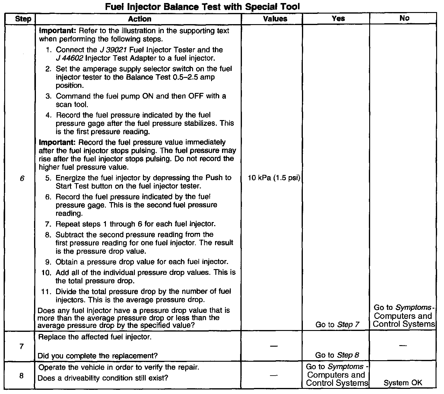 6. If the pressure drop value for each fuel injector is within 10 kPa (1.5 psi) of the average pressure drop value, the fuel injectors are flowing properly.