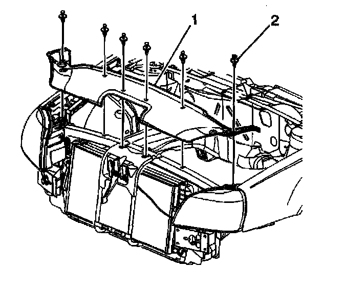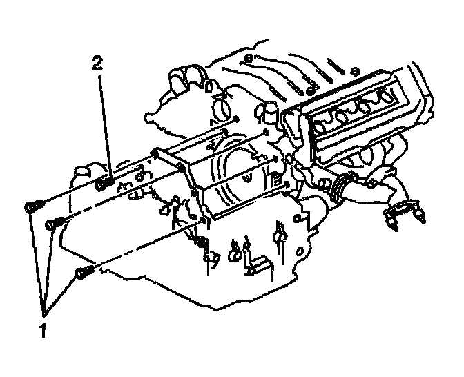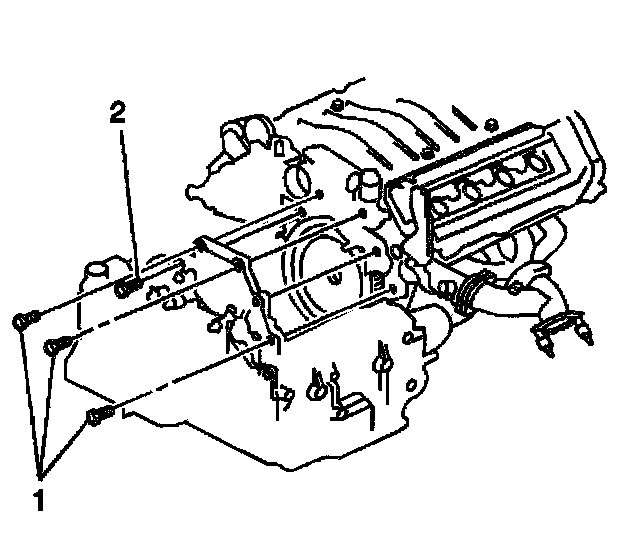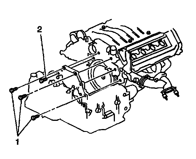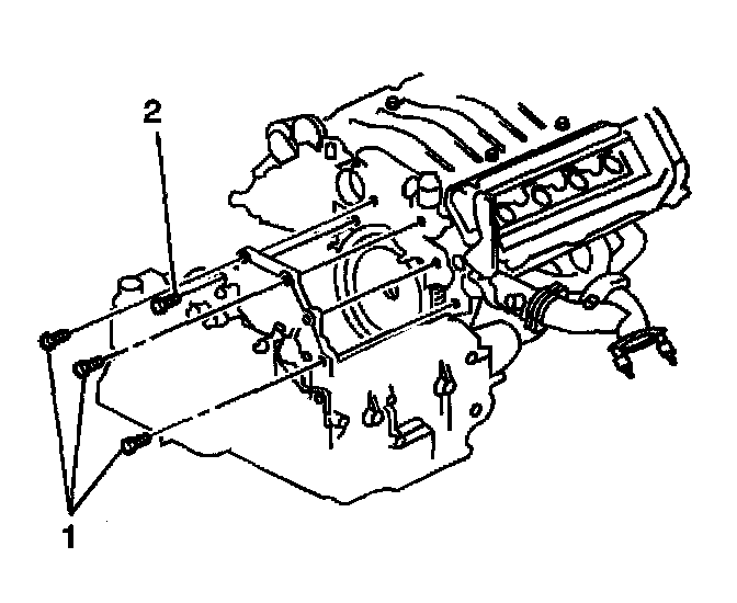 9. Remove the transaxle to engine bolts (1). The remaining bolt (2) will temporally retain the transaxle and will be removed from the underside of the vehicle.