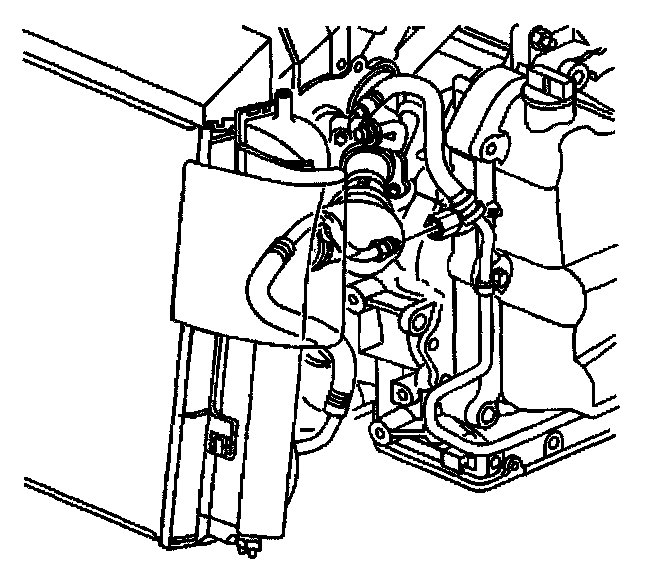 12. Disconnect the upper transaxle oil cooler pipe from the radiator using the J 41623-B. Install plugs in the oil cooler pipe and the radiator to prevent fluid loss and contamination.