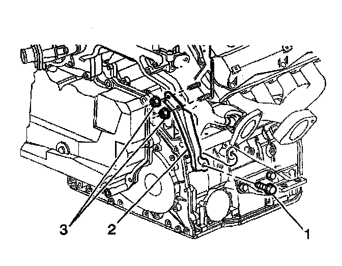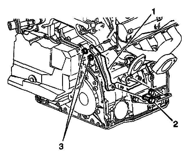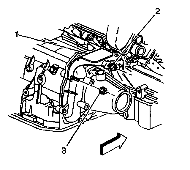 29. Remove the nuts (2, 3) securing the vehicle speed sensor heat shield (1) to the transaxle.
