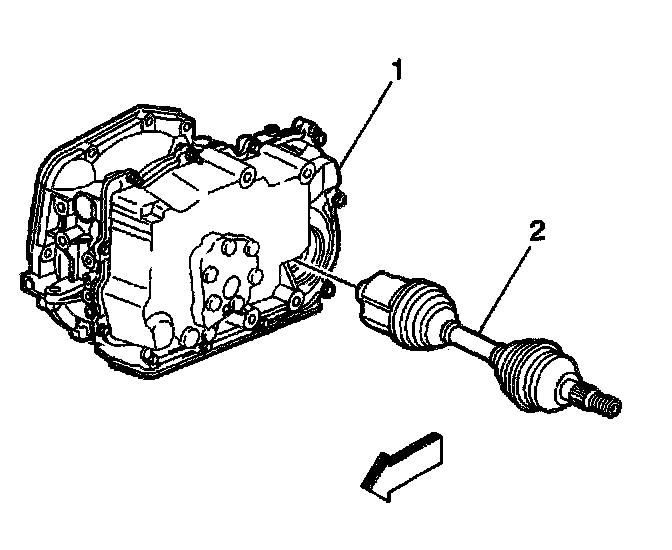 34. Disengage the right and left drive shafts (2) from the transaxle (1). The drive shafts do not have to be removed from the wheels.