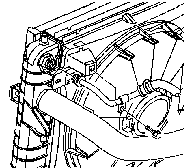 11. Remove the upper transaxle oil cooler pipe retaining bolt from the radiator fan shroud.