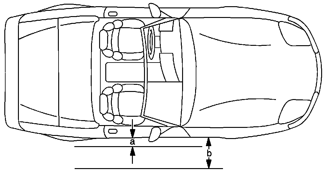 2. Hold the transmitter at hip-level height and greater than 39 inches/1 meter (refer to item "b" in diagram) from the exterior of the driver's door.