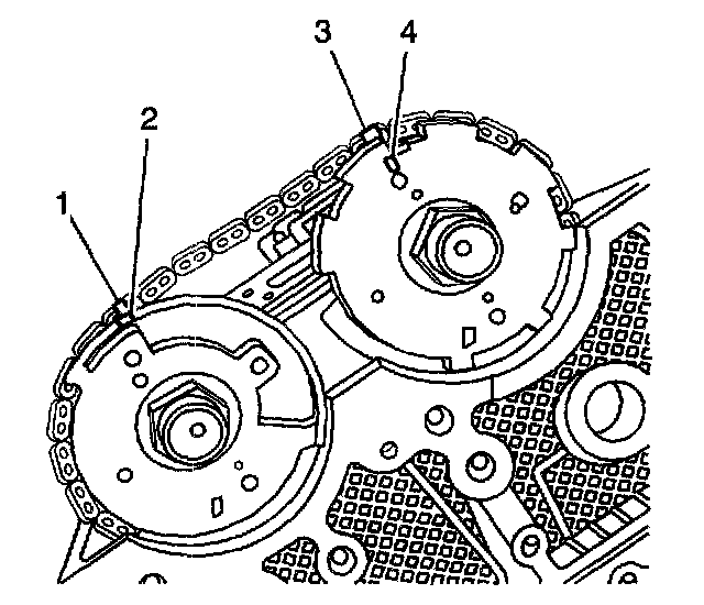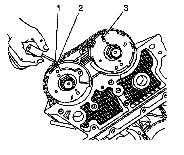 Important: The secondary timing chain has black links that are used for alignment when the primary and secondary timing gear and chain assemblies are being installed together. IT IS NOT NECESSARY for the black chain links to be aligned with the camshaft actuator timing marks when the secondary chain and gear components are being serviced separately.