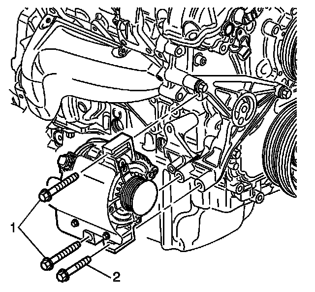 7. Loosely install the generator side bolts. Ensure the longer bolts (1) are installed in the upper and lower rear positions and the shorter bolts (2) are installed into the lower front position.