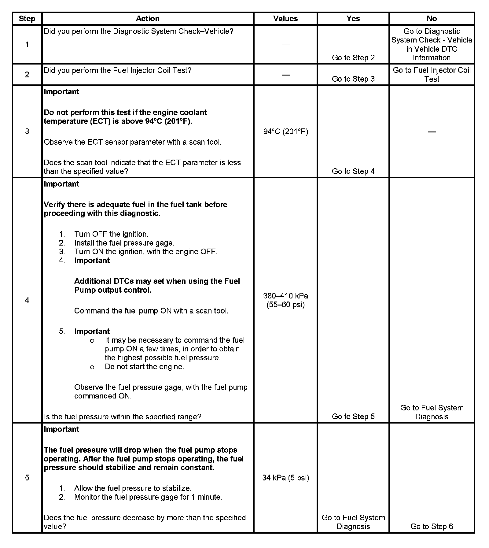 5. This step tests for an internal fuel leak. If the fuel pressure drops during this test, then an internal loss of pressure is indicated. The fuel pressure should reach a steady value.