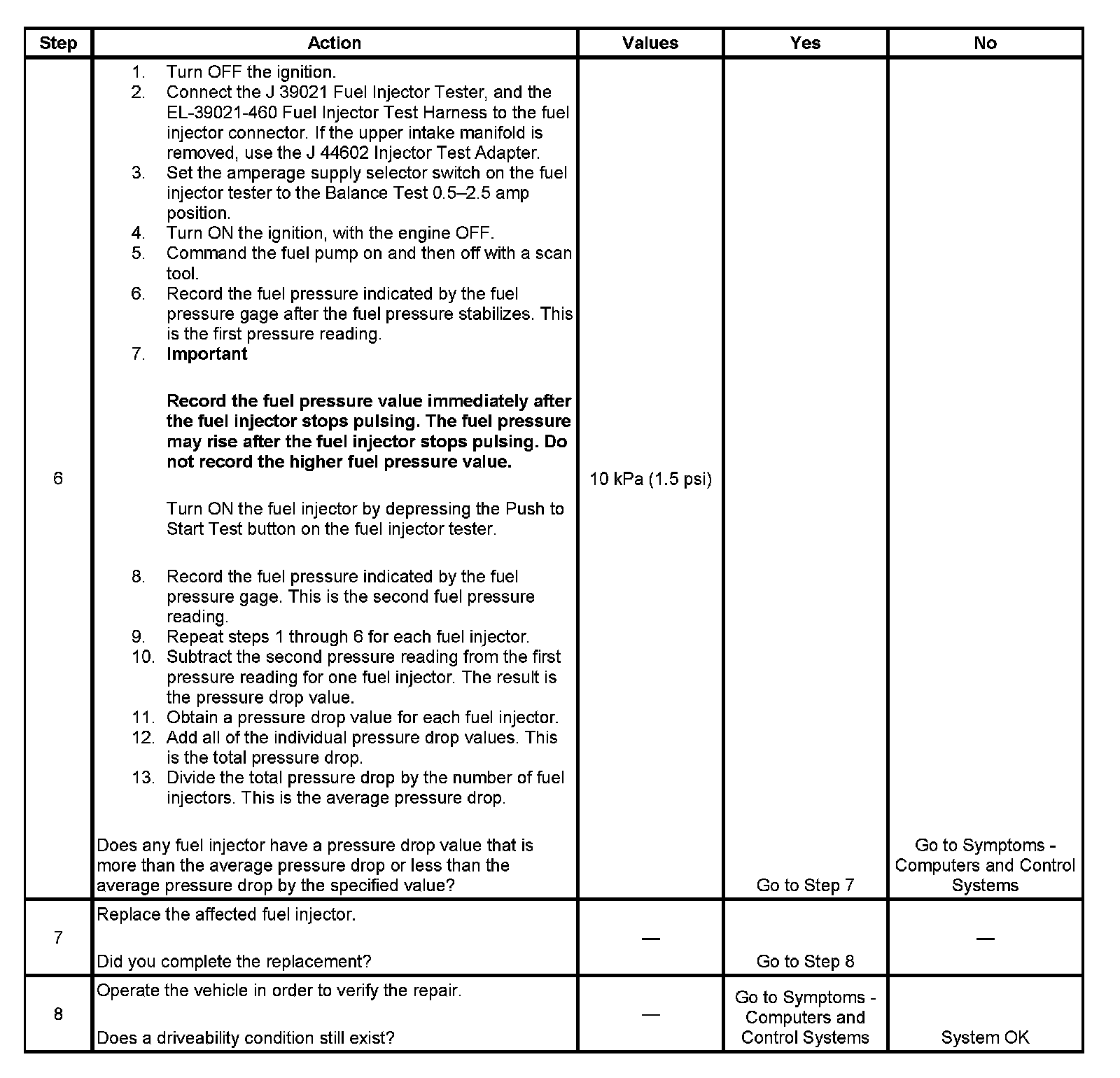 6. If the pressure drop value for each fuel injector is within 10 kPa (1.5 psi) of the average pressure drop value, the fuel injectors are flowing properly. Calculate the pressure drop value for each fuel injector by subtracting the second pressure reading from the first pressure reading. Refer to the illustration.