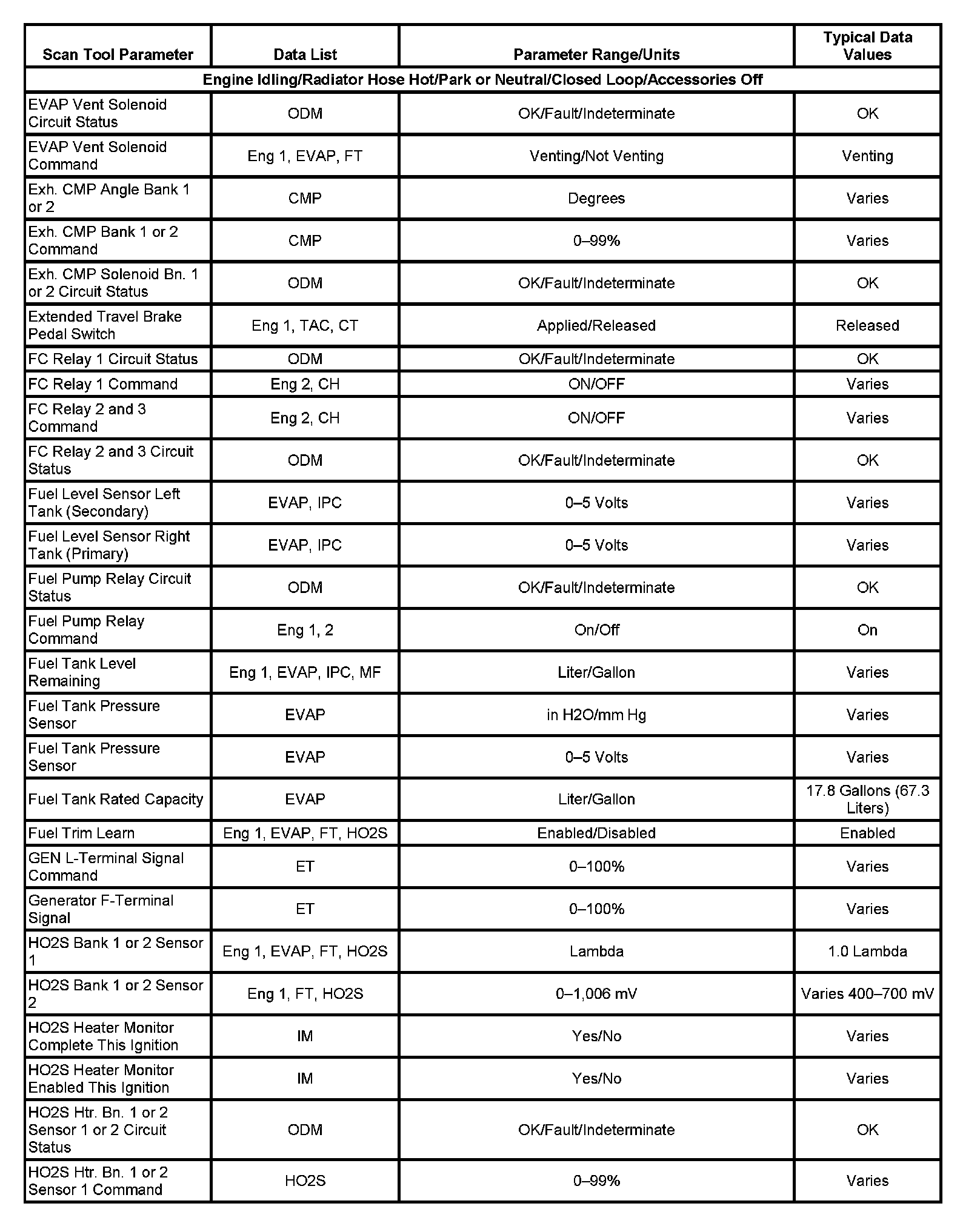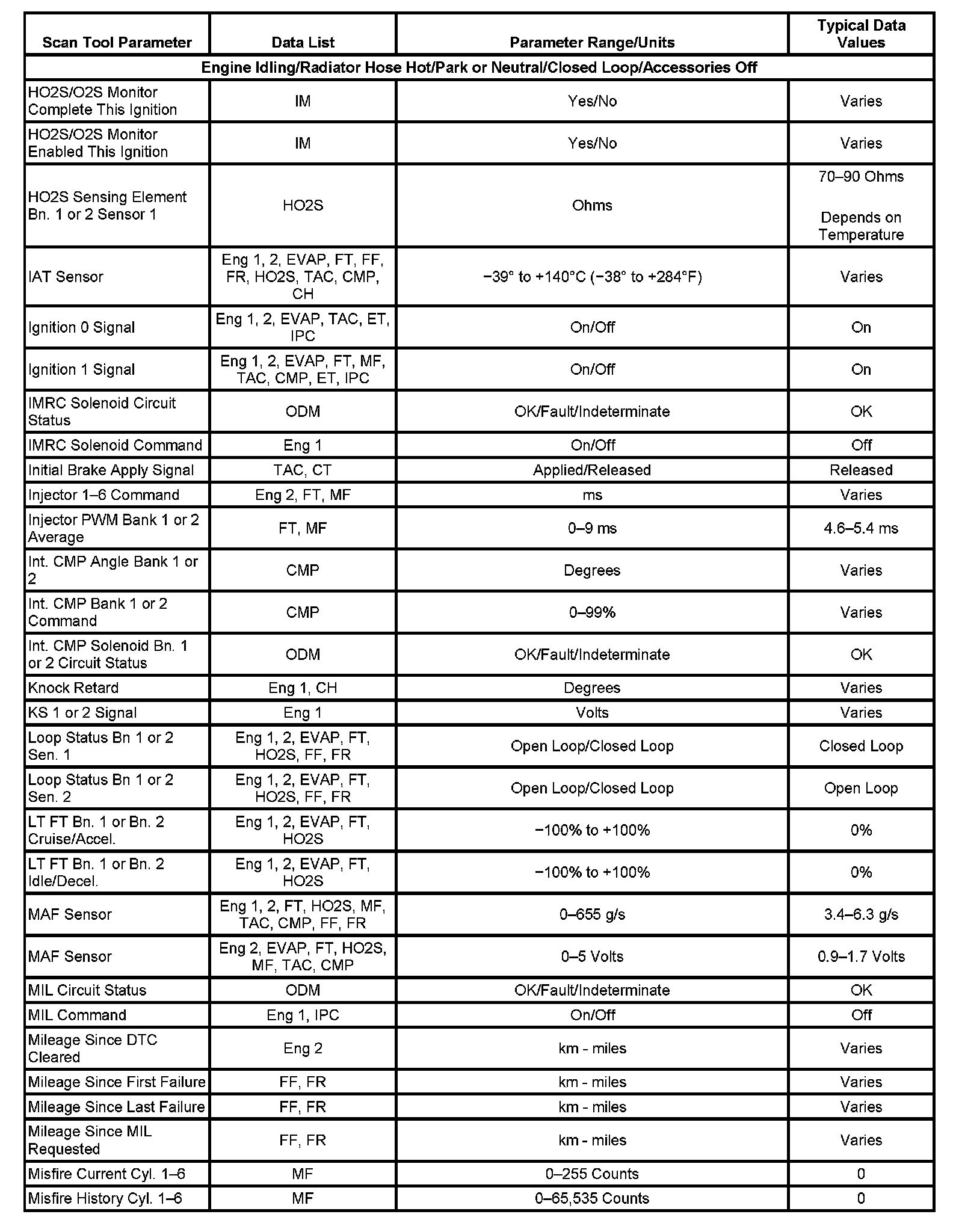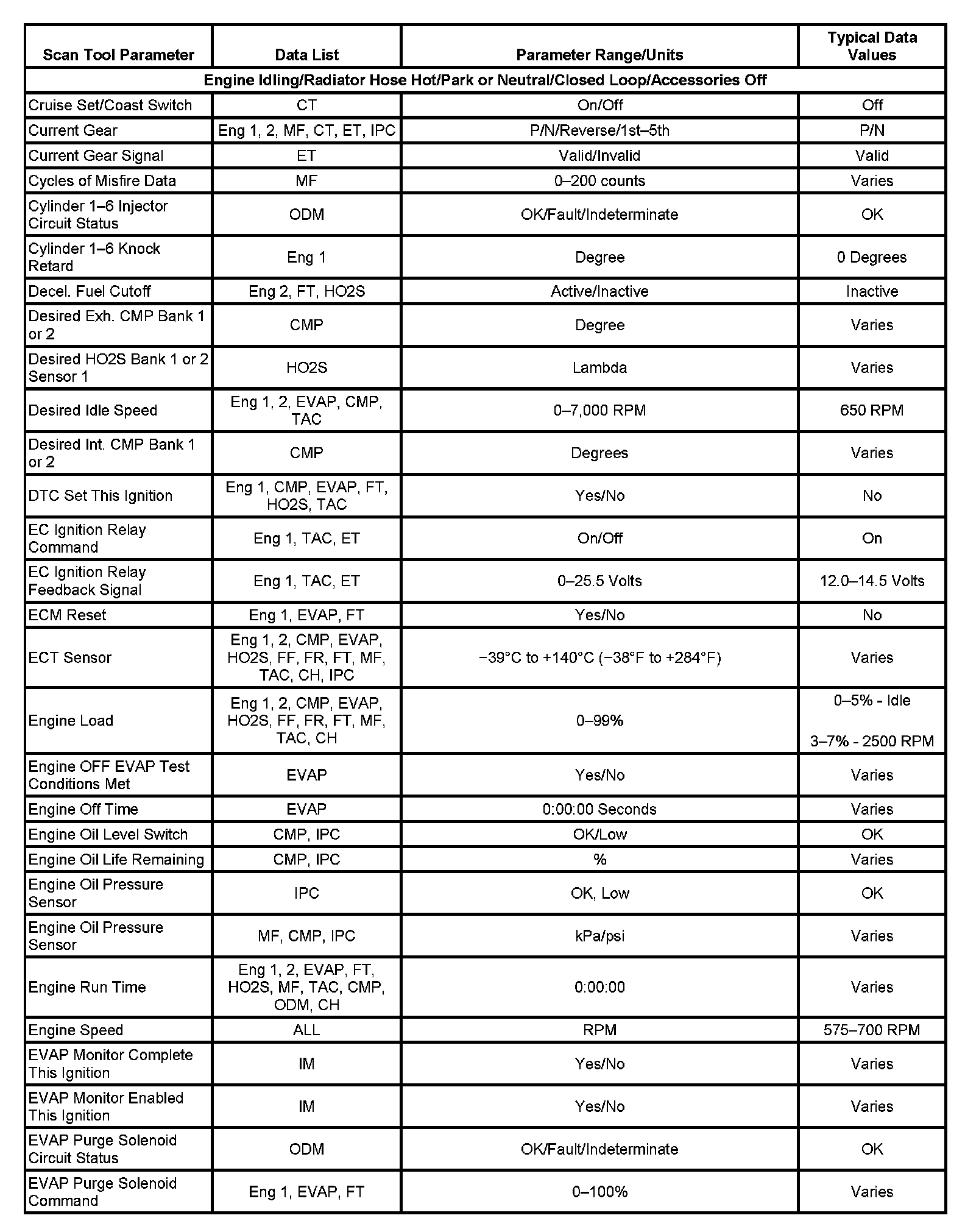 The Engine Scan Tool Data List contains all engine related parameters that are available on the scan tool. The list is arranged in alphabetical order. A parameter may appear in any one of the data lists, and in some cases may appear more than once, or in more than one data list in order to group certain related parameters together.