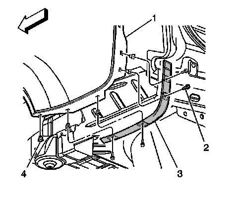 3. Install the bolts (2) to secure the bumper bracket (3) to the quarter panel.