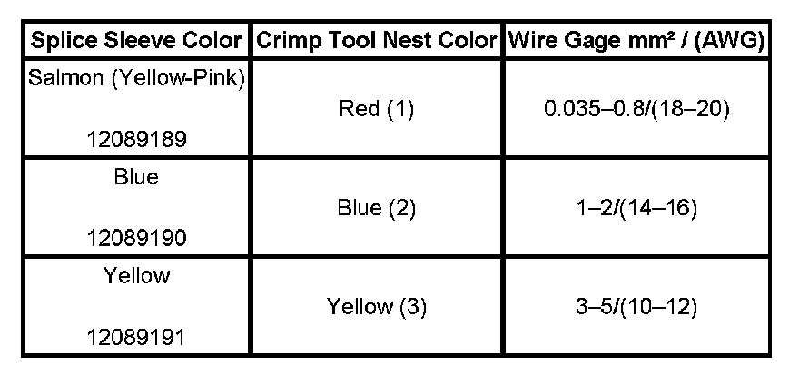 5. Use the Splice Crimp Tool from the J-38125 to crimp duraseal splice sleeve. In order to position the duraseal splice sleeve in the proper color nest of the Splice Crimp Tool, refer to the table at the beginning of this repair procedure.