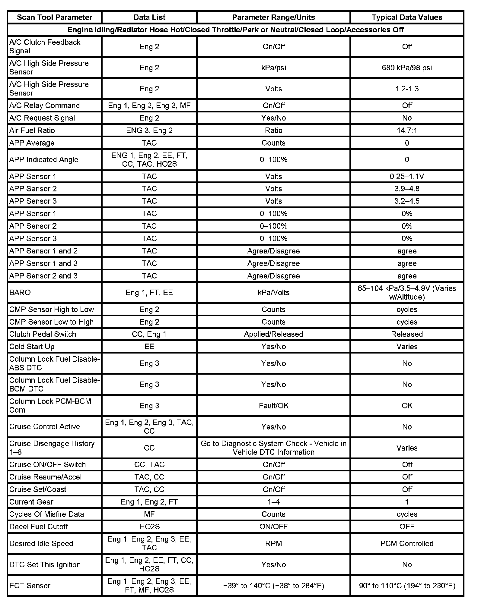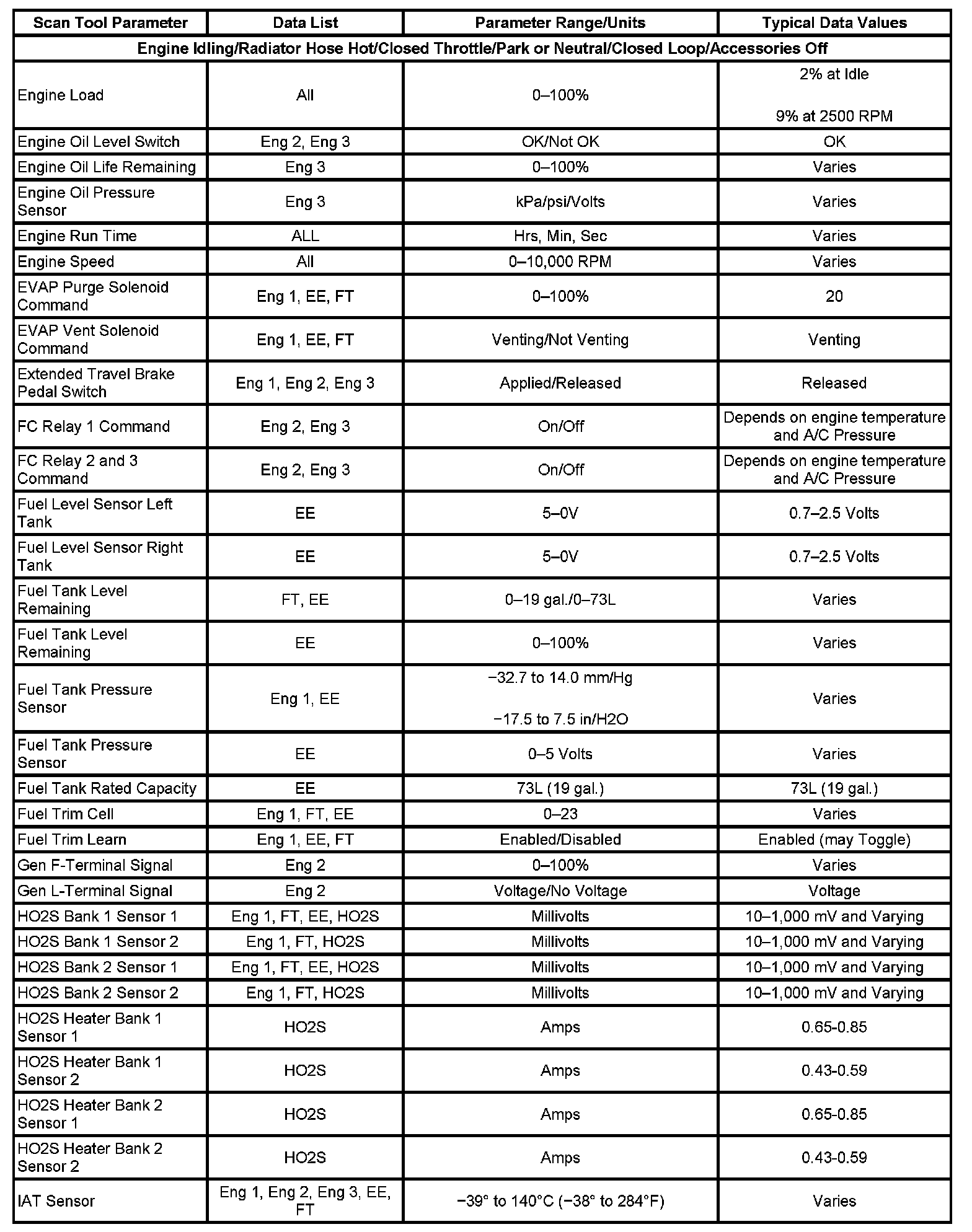 The Engine Scan Tool Data List contains all engine related parameters that are available on the scan tool. The list is arranged in alphabetical order. A parameter may appear in any one of the data lists, and in some cases may appear more than once, or in more than one data list in order to group certain related parameters together.