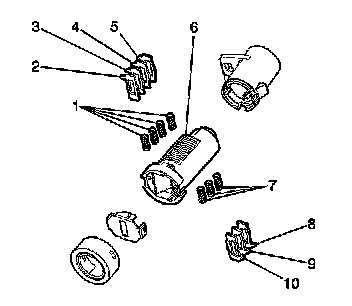 Each of the 4 cut depths on the key has corresponding tumblers, sometimes referred to as plates or wafers. The tumbler depth number is stamped on the tumblers for identification. Door, rear compartment, ignition tumblers and glove box tumblers represent 3 different series. There are also 3 different compression springs - with door and rear compartment sharing the same part numbers and ignition and glove box with separate part numbers. The I/P storage compartment lock cylinder also requires a retainer tumbler in the position closest to the front key insertion surface of the cylinder. The retainer tumbler is not moved by the key, its function is to retain the I/P storage compartment lock cylinder in the lock assembly. It is essential that the correct components be used in tumbling of locks. The compression springs are inserted into the spring wells, then the correct tumblers are inserted into the tumbler wards.
