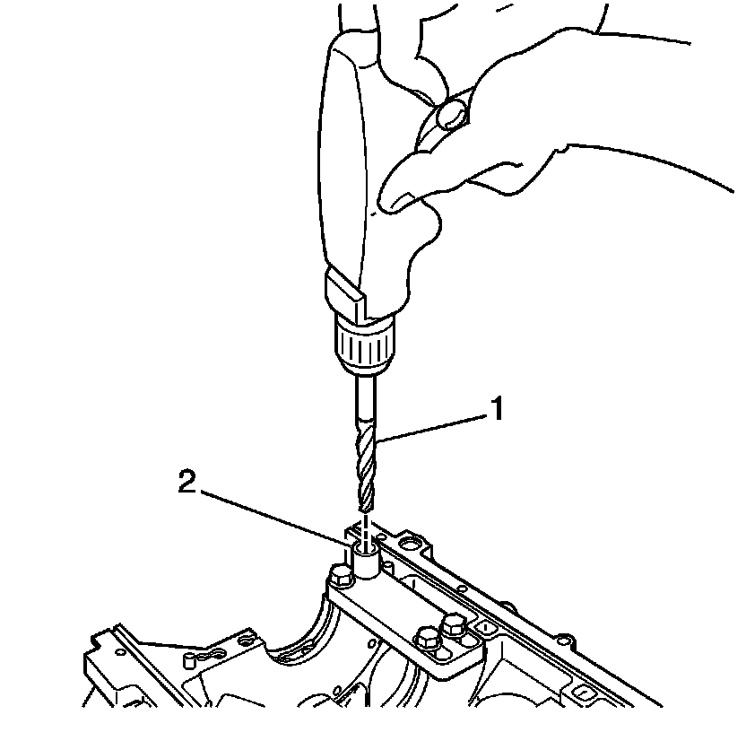 ^ Drill the crankshaft main bolt hole until the mark (1) on the drill aligns with the top of the drill bushing (2).