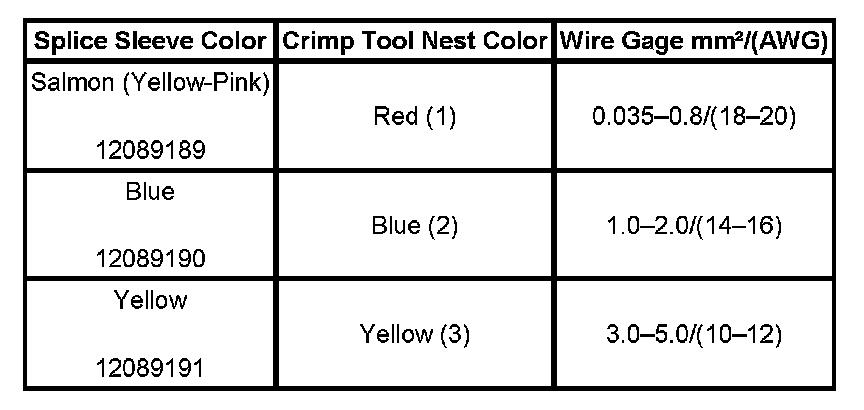 4. Select the proper duraseal splice sleeve according to the wire size. Refer to the above table at the beginning of the repair procedure for the color coding of the duraseal splice sleeves and the crimp tool nests.