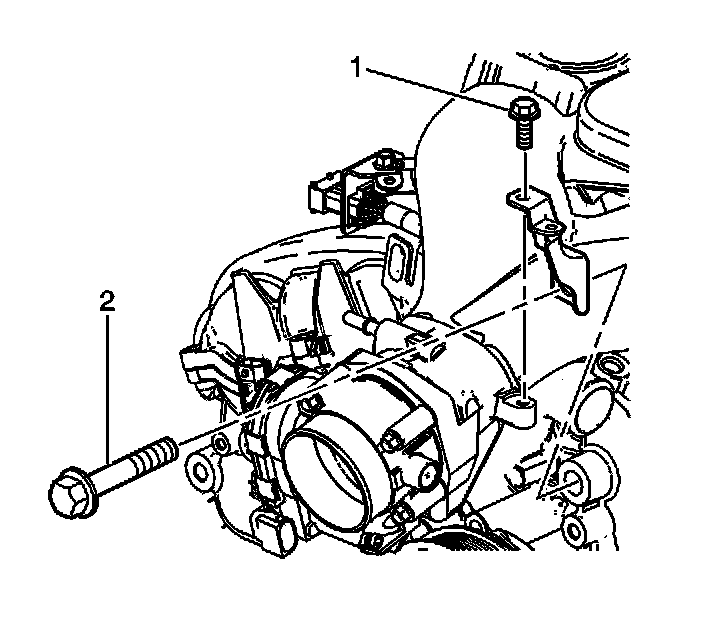 - Remove the intake manifold brace bolts (1 and 2) and the brace.