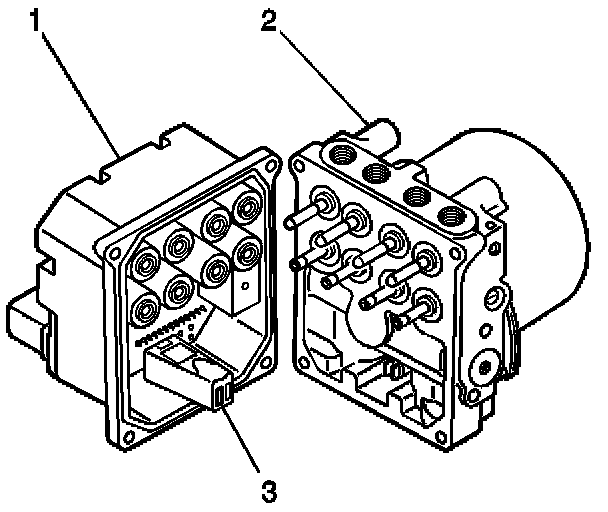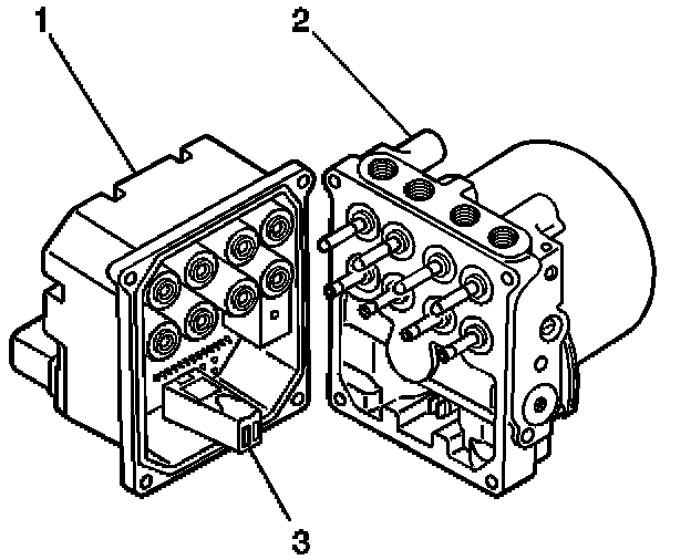 2. Make sure that the internal pump motor connector (3) is installed into the new EBCM (1) prior to EBCM replacement.