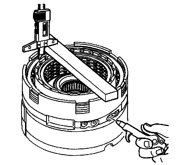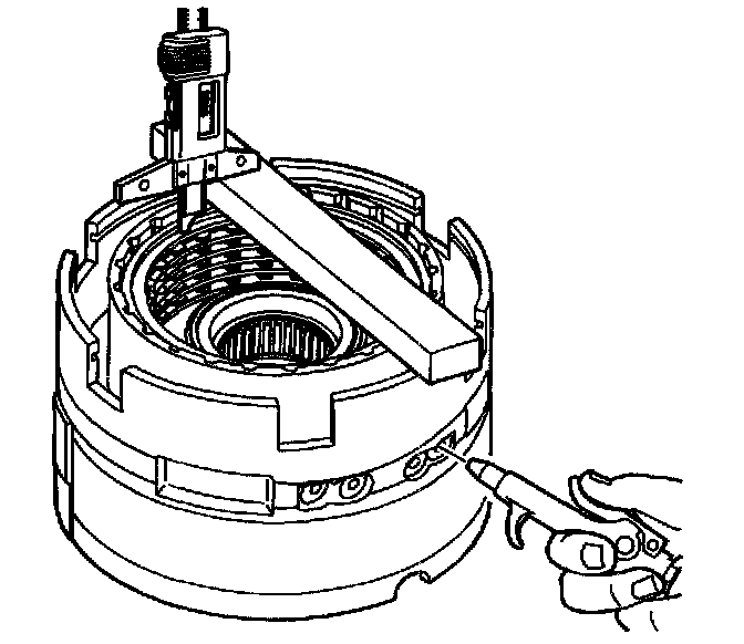 13. Apply 65 PSI (448.17 kPa) of air pressure to the specified port. Measure the distance between the 2nd clutch backing plate and the bottom of the gage bar. Measure three times in different locations on the backing plate. Record this as H2.