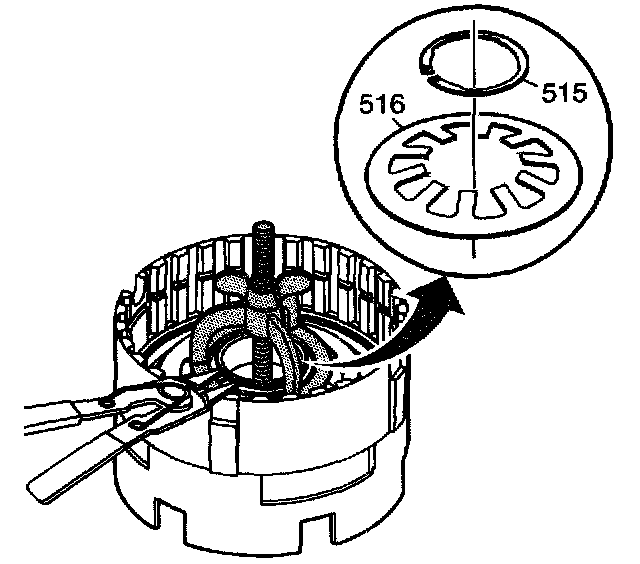 29. Install the low and reverse clutch spring retainer ring (515) into the center support (518).