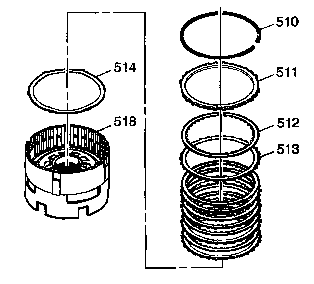 31. Install the low and reverse clutch plates. Start with the low and reverse clutch plate (513) with external splines. Alternate with the low and reverse clutch plate (512) with internal splines.