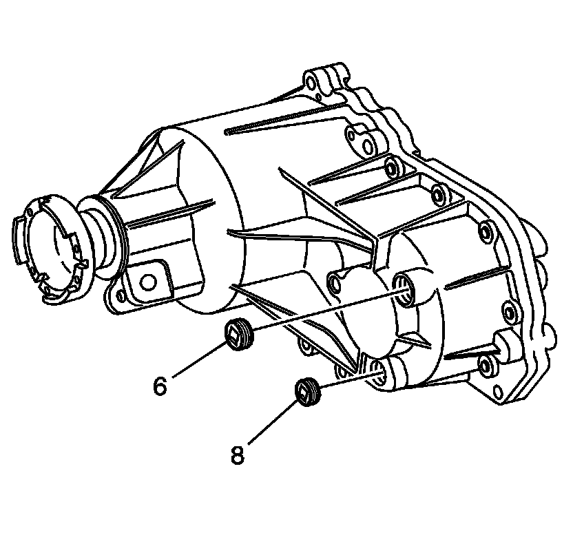 2. Remove the drain plug (8) and the fill plug (6). Ensure all transfer case fluid is drained out of the transfer case.