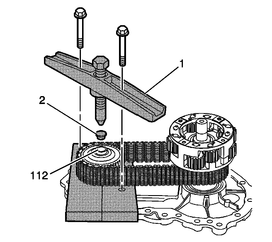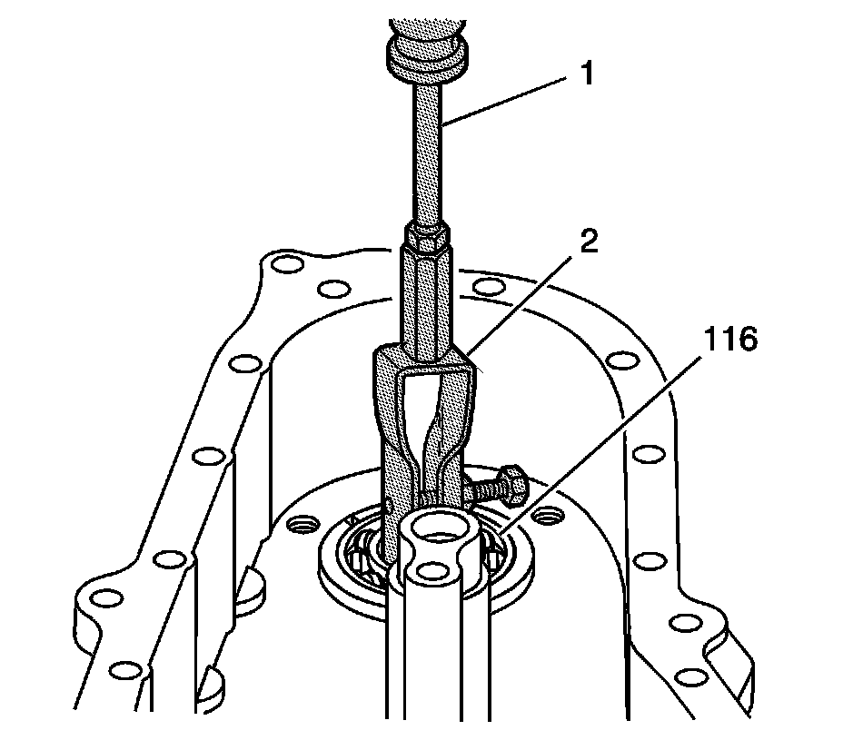 Using the J-2619-A (1) and the J 29369-1 (2), remove the front output cover bearing (116) from the cover.