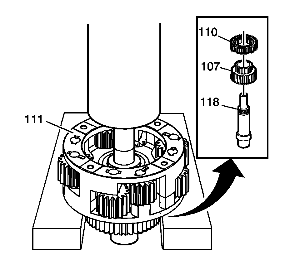 25. Using a press, remove the input shaft assembly (118, 107 and 110) from the carrier (111).