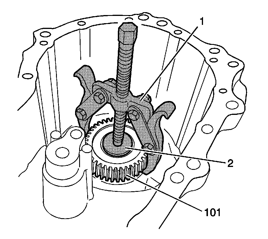 27. Using the J 22888-20A (1) and the J 8107-2 (2), remove the sun gear (101) from the rear output shaft.