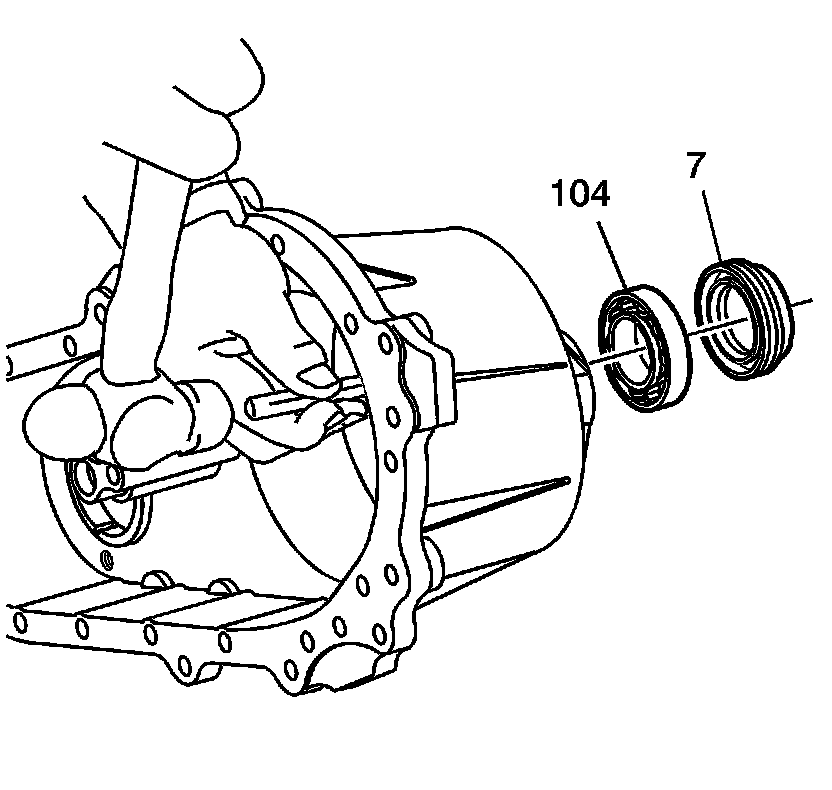Using a hammer and a suitable punch, from inside the cover, drive out the rear output seal (7) and the outside output bearing (104).