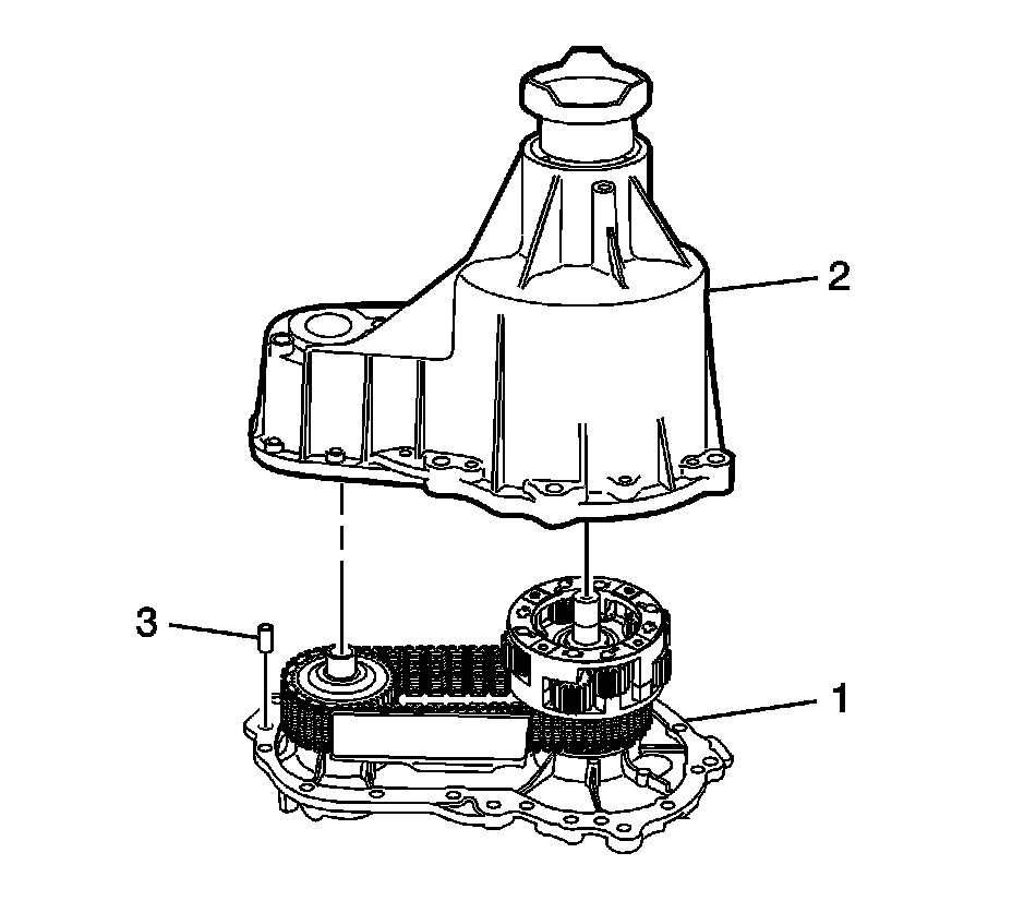 30. Lower the cover (2) over the case (1). Turn the rear output shaft in order to align the splines and the shaft into the bearing in the cover.