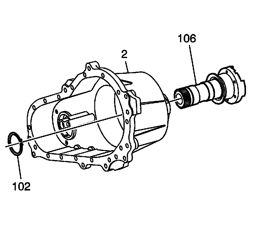 25. Install the rear output shaft snap ring (102) in the lower groove of the output shaft (106).