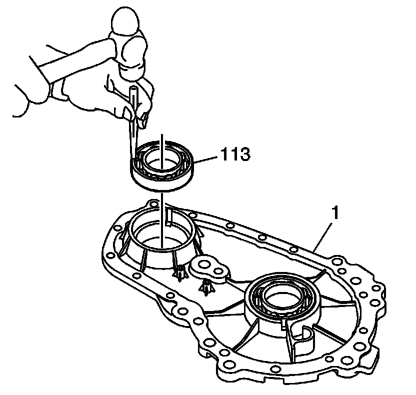 Install the front output shaft bearing (113) into the case (1).