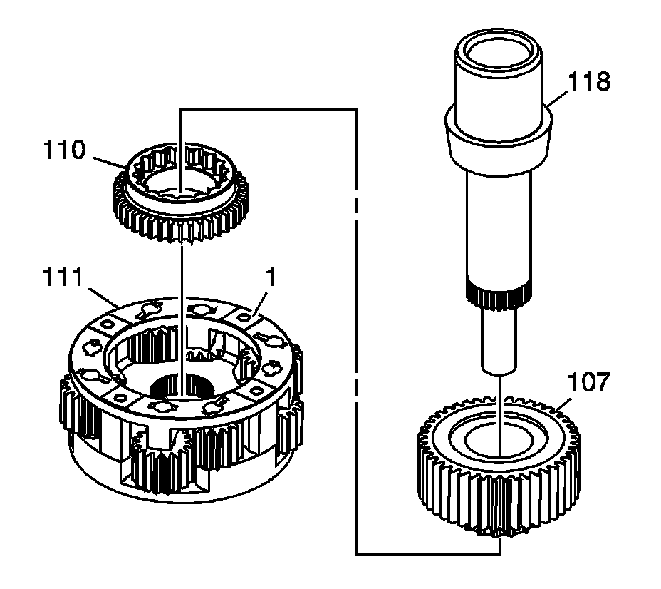 10. Important: The input shaft (118) must be installed to the carrier (111) with the raised bosses (1) facing up and the thrust washer groove facing down. Reversing this will cause the wrong torque split of 60/40, in some models.