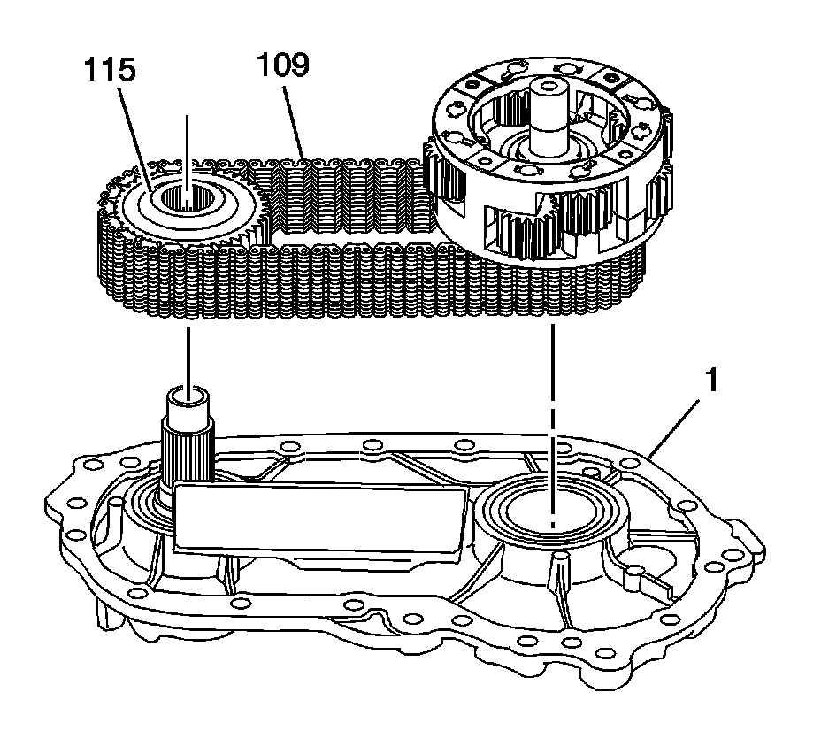18. Assemble the chain (109), upper gear of the planetary assembly, and lower sprocket (115) to the case (1).