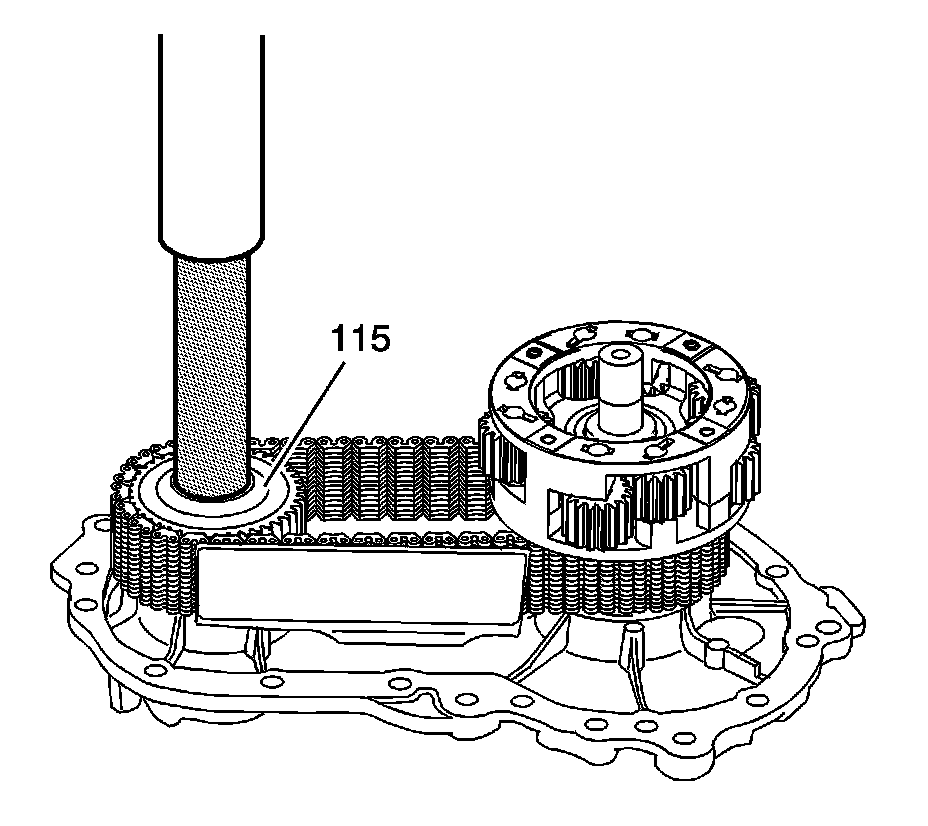 19. Use the J 5590 and a press to fully seat the lower sprocket (115) to the front output shaft, while guiding the input shaft of the planetary assembly, until it is seated to the case.