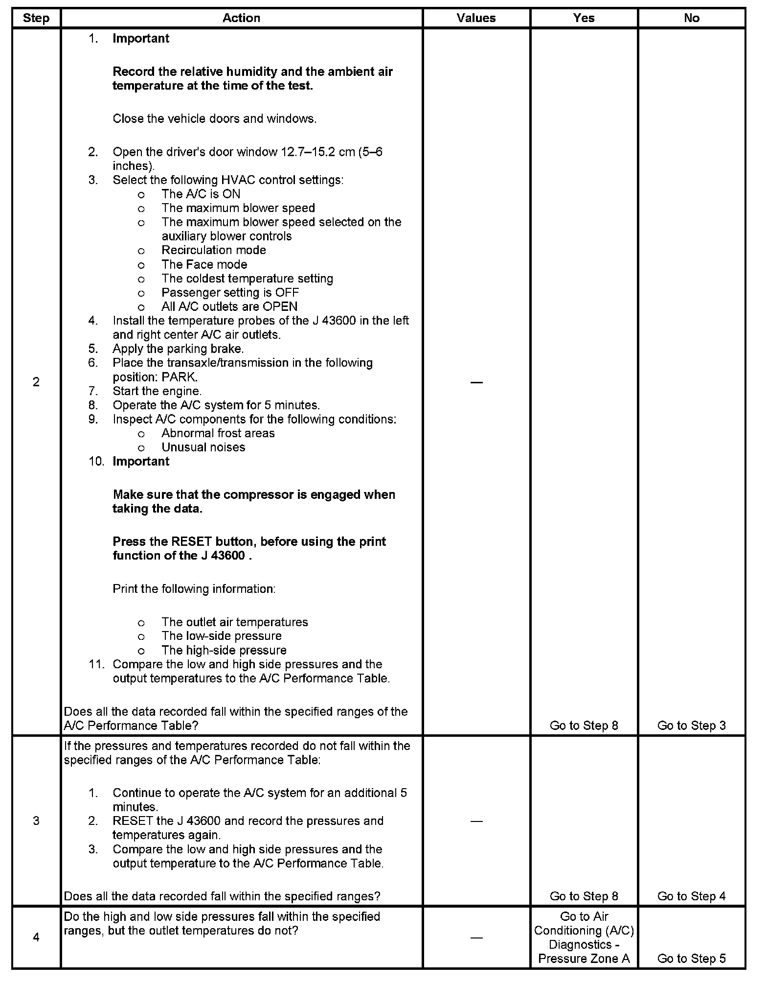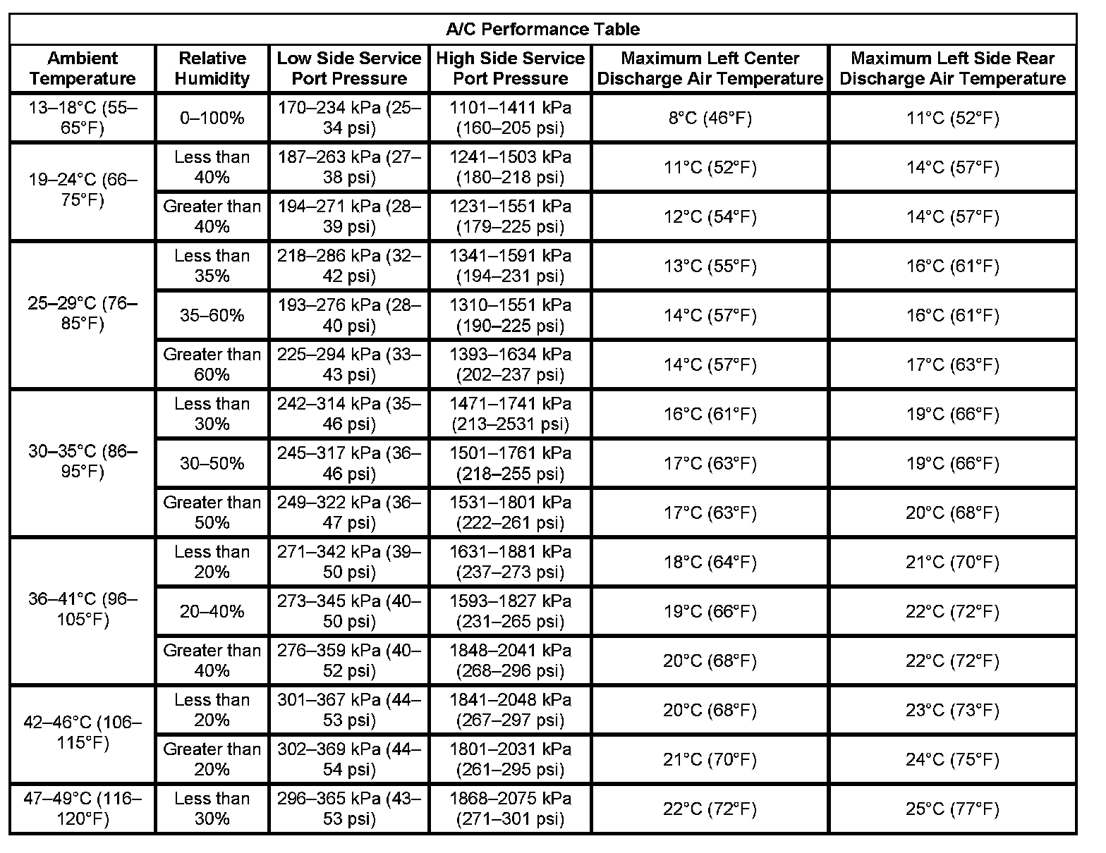 A/C Performance Table: