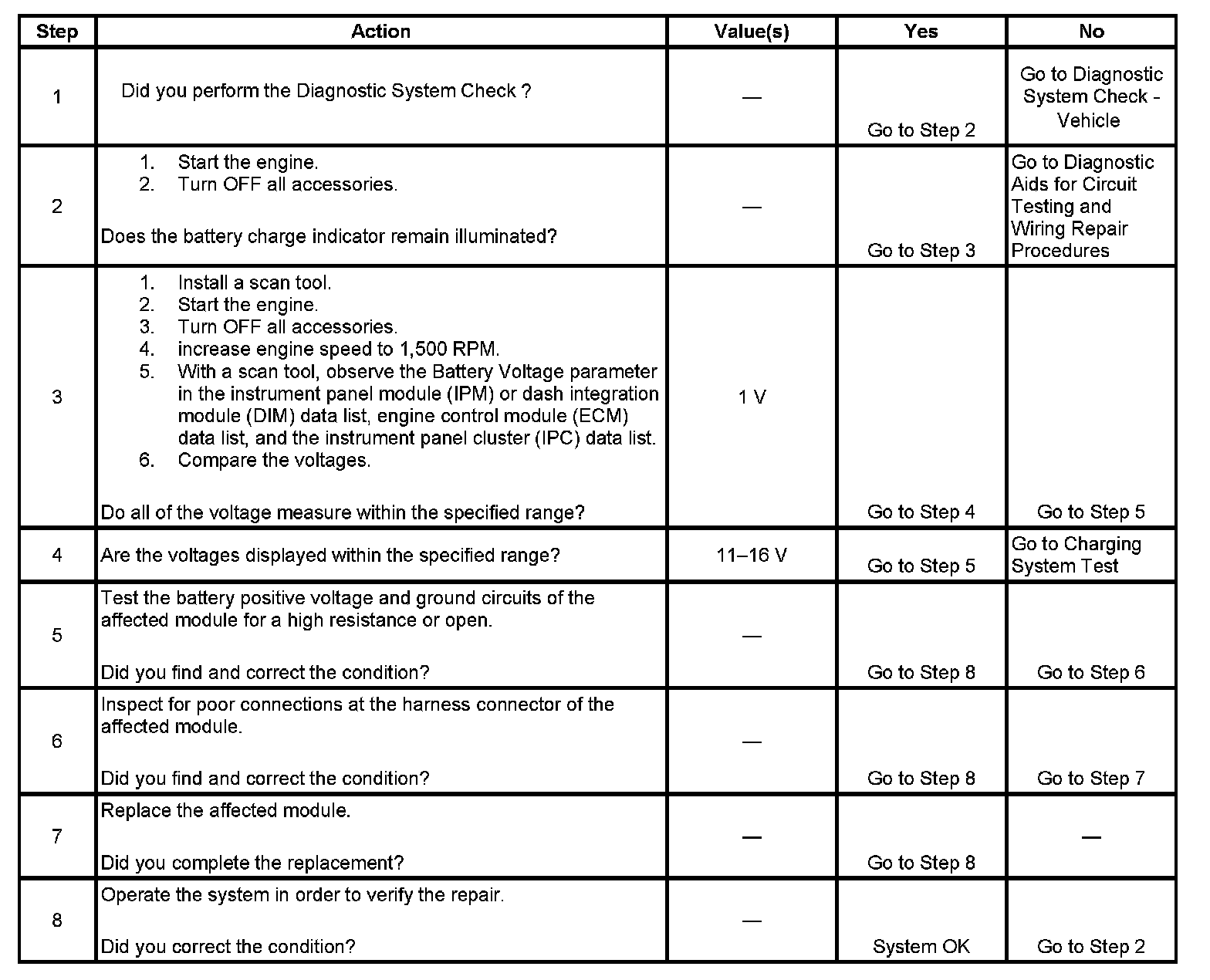 The driver information center (DIC) may display a "Charging System Failure" message. This message being displayed is the result of a class 2 message being sent by the engine control module (ECM), instrument panel module (IPM), dash integration module (DIM), or the instrument panel cluster (IPC) to the DIC. Each module has a different criteria for requesting the message to be displayed. Refer to Charging System Description and Operation.