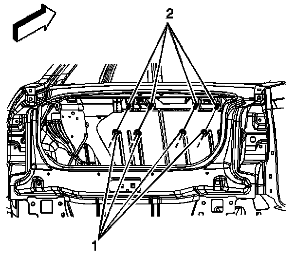 5. From inside of the trunk, remove the two upper outer nuts (1) on each side (four nuts total). Do not remove the inner three nuts.