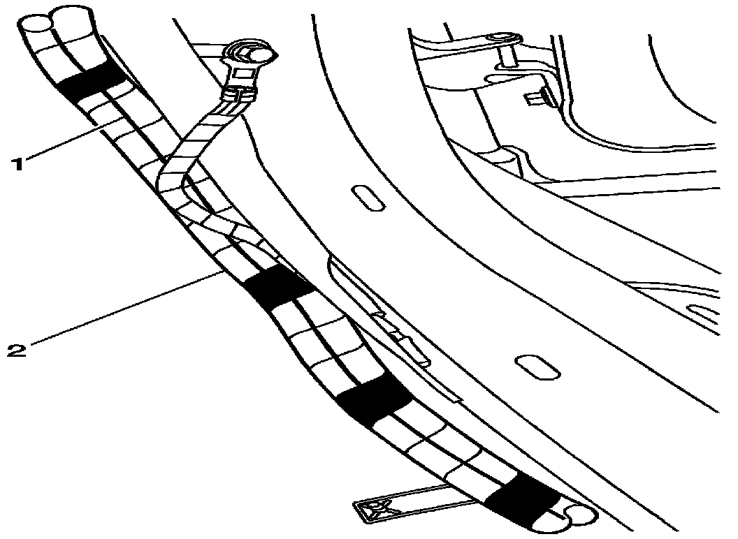 27. When the harness (2) exits the conduit (1) in the rear floor pan area, continue routing and taping the new wire to the outside of the existing harness.