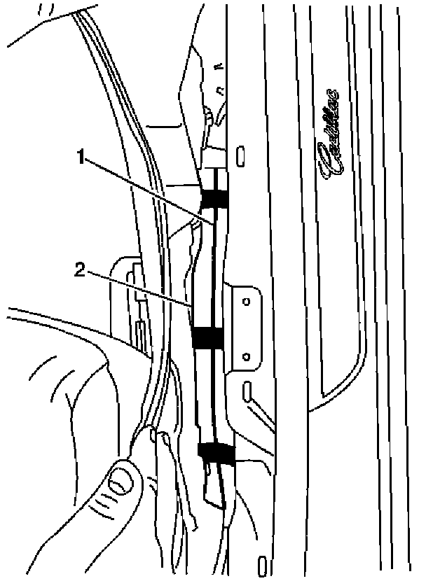 28. Continue taping the new wire to the harness (1) as it goes up to the "C" pillar area.