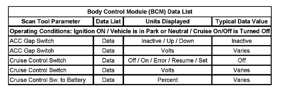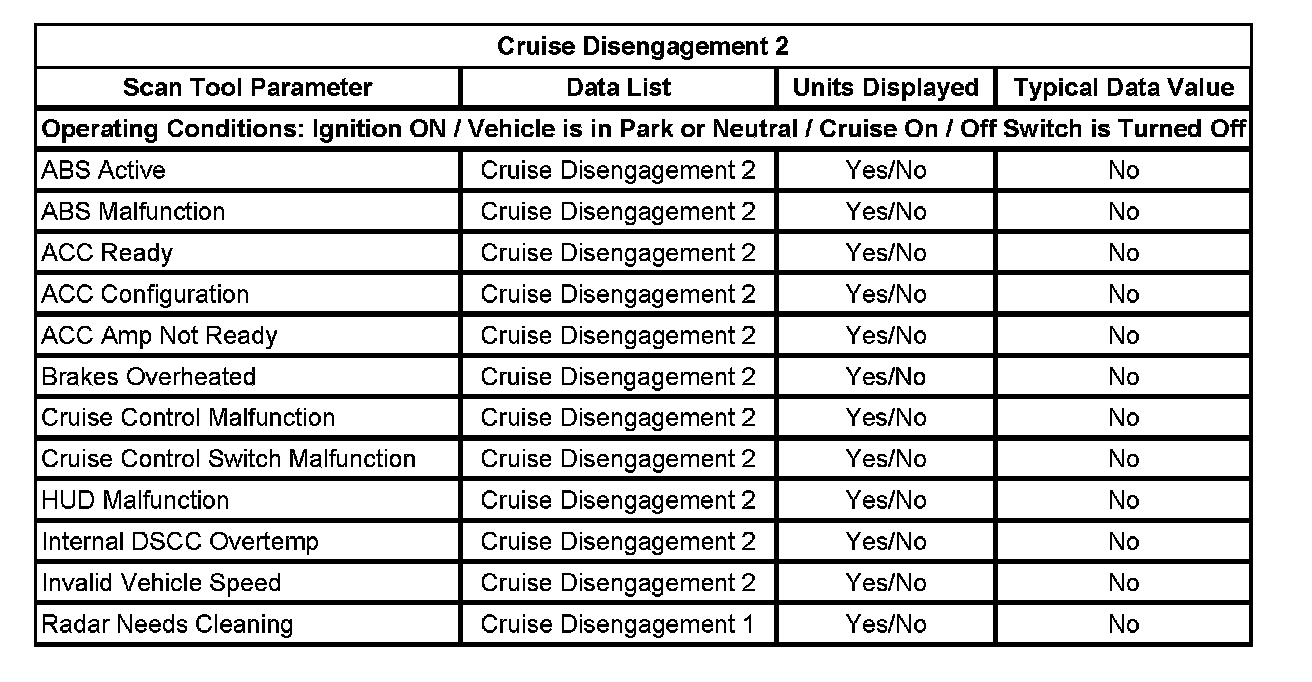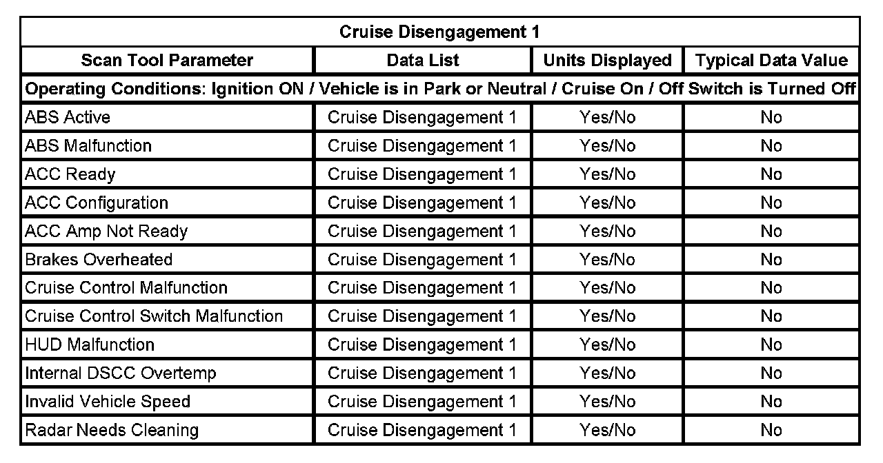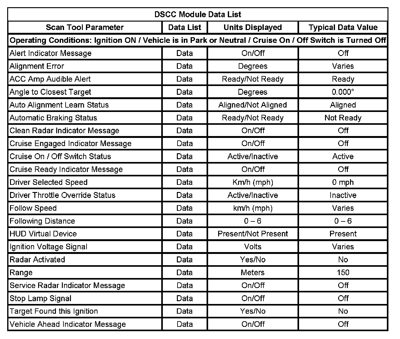 The scan tool data lists contain all the distance sensing cruise control (DSCC) module related parameters that are available on the scan tool for the adaptive cruise control (ACC) system. The parameters in the list are arranged in alphabetical order. The data list column indicates the location of the parameter within the scan tool menu selections.