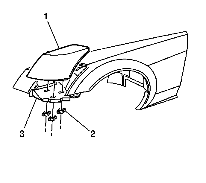 9. Install the nuts (2) attaching the headlamp (1) to the front wheelhouse (3).