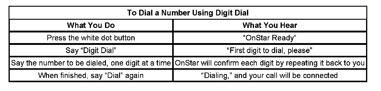 After 3 unsuccessful tries, or if you simply like it better, you can use the "Digit Dial" command to input digits one at a time. Digit Dial is set up to dial phone numbers like previous OnStar Personal Calling Systems.