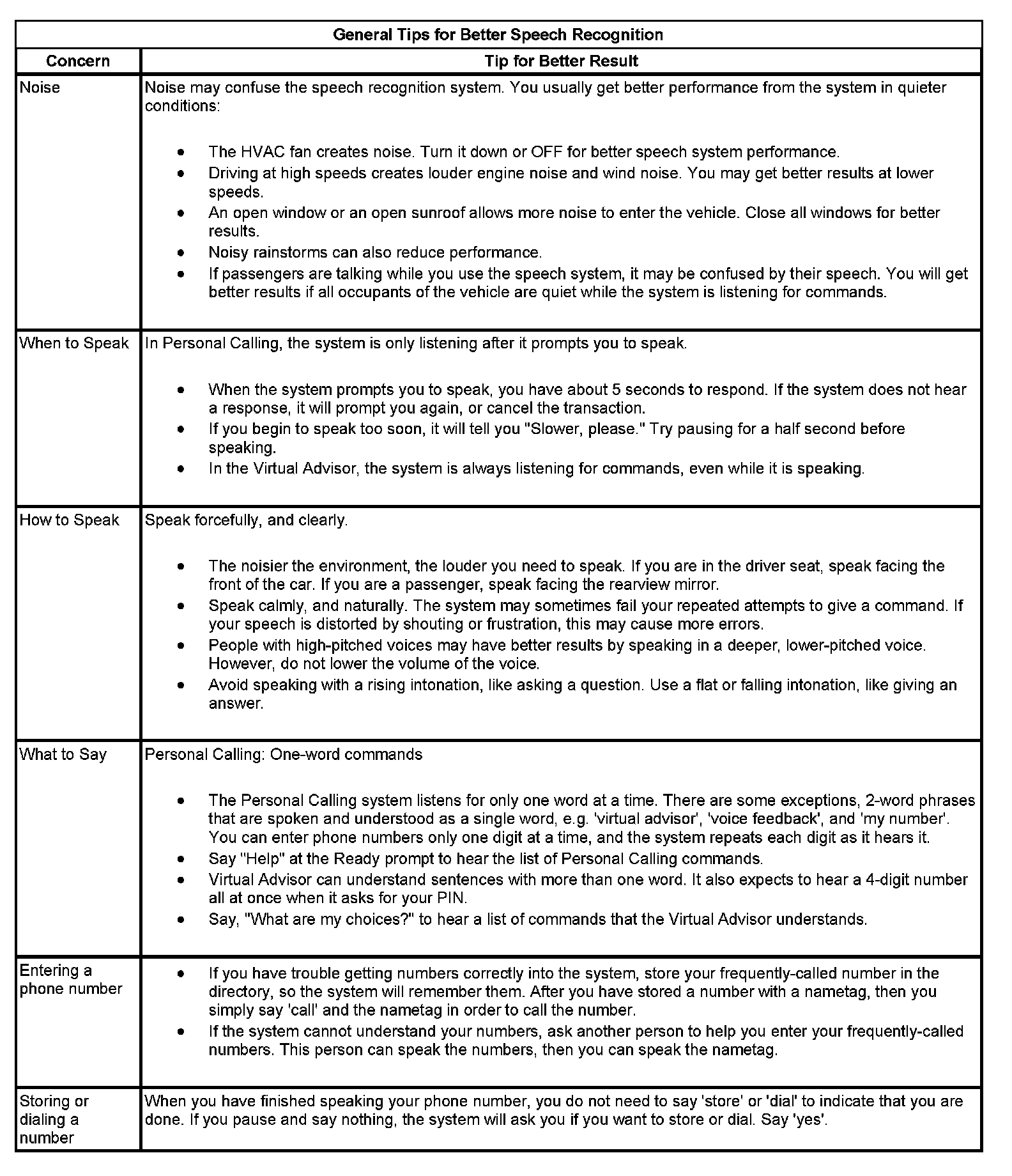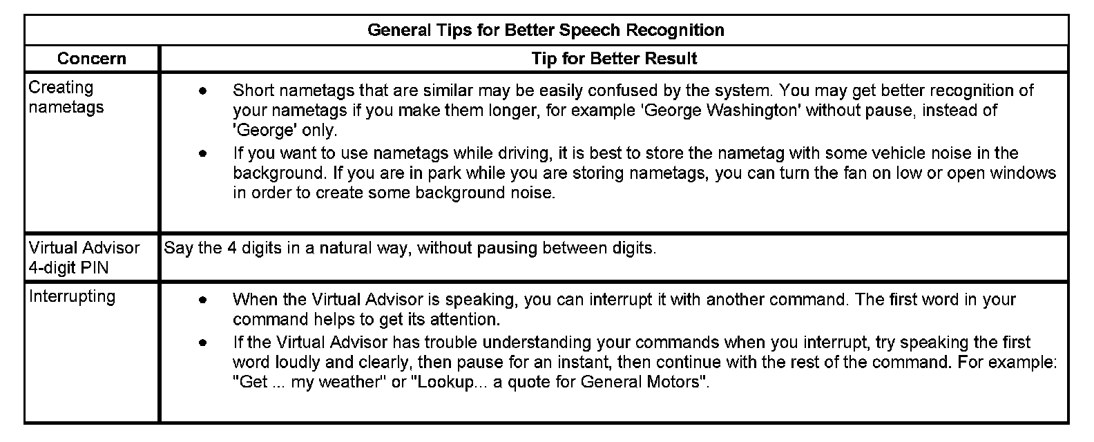 The OnStar(R) speech recognition systems use speech technology that is designed to understand a wide range of American English speakers. Although there is no one right way to speak English, the system will work best when users try to modify their pronunciation should they encounter difficulty. Users who do not obtain good results are advised to try the tips and workarounds found.