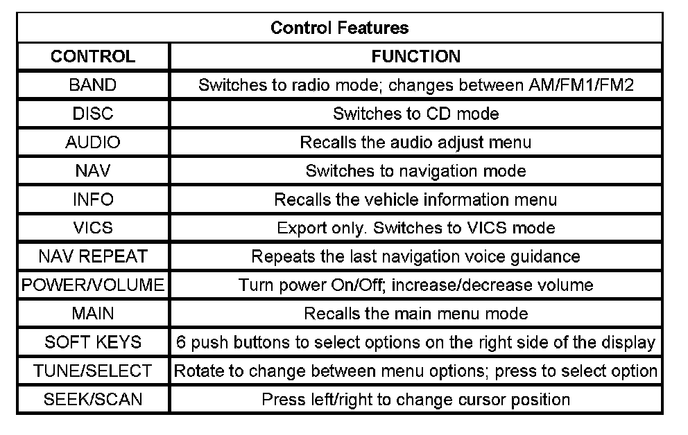 - Soft keys on the right side of the display to allow selection from menus and to operate the navigation system, the audio system and the (export) TV system