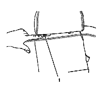 1. Push in on the release tab located on the head restraint retainer (1) to remove the rear head restraint from the retainer.