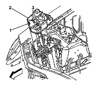 9. Remove the fasteners (1, 2) securing the electrical center (3) to vehicle.
