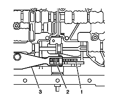 12. Install a 0.8 mm spacer (2) between the manual shaft detent lever (1) and the manual shaft detent spring (3).