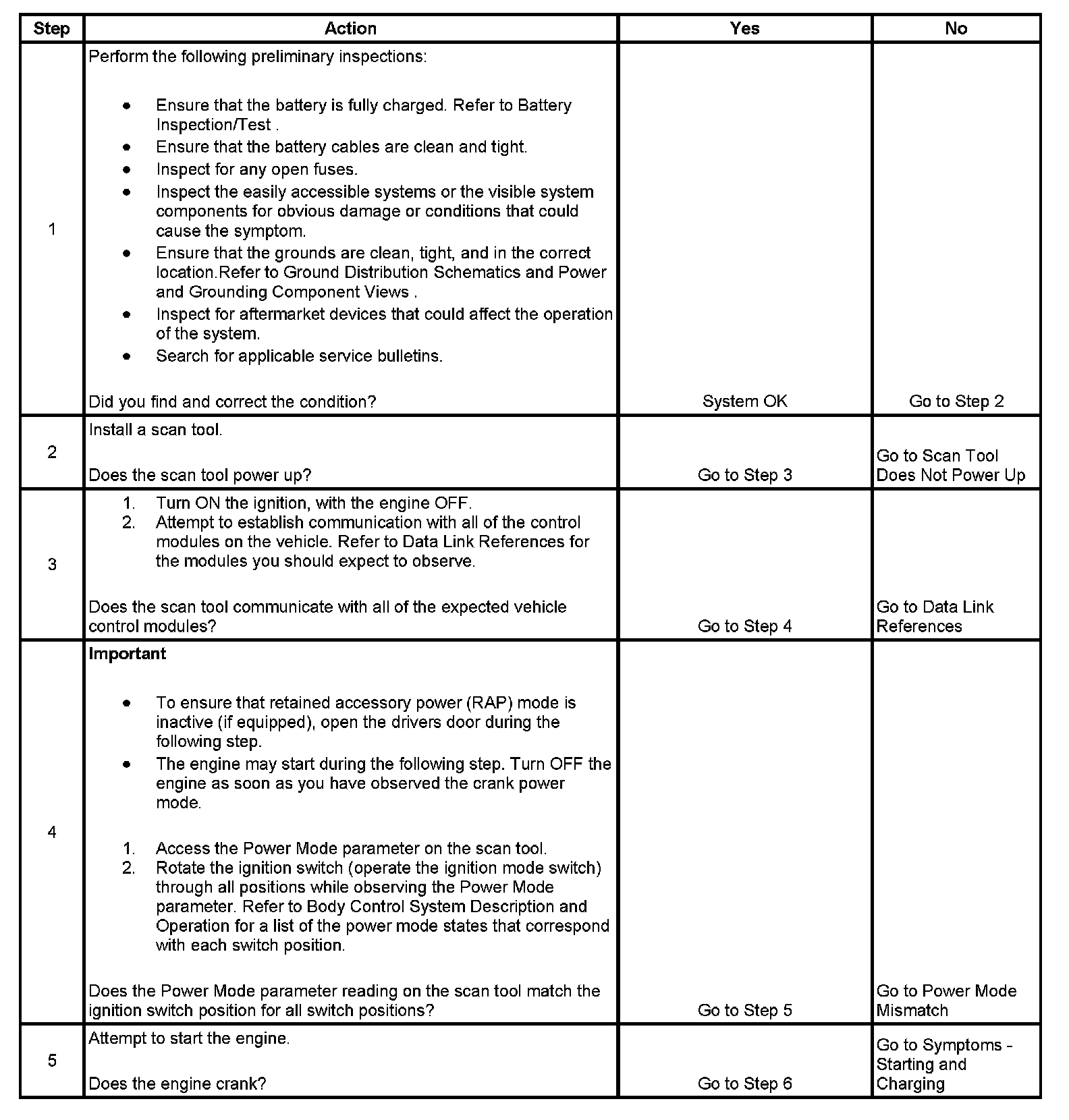 4. A module that is operating in the incorrect power mode based on key position may cause other vehicle symptoms and/or DTCs to set. The information in Power Mode Mismatch will correct the condition before checking for module DTCs or symptoms.