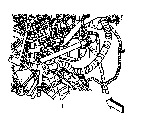 9. Connect the engine wiring harness retaining clips (1) to the transmission mounting bolts.