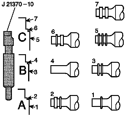 Refer to the chart in order to determine the correct low and reverse band servo pin length to use. A, B and C on the chart refer to markings on the J 21370-10 Band Apply Pin Gauge. Numbers 1-7 match the correct piston pin length to the J 21370-10 land indicated by the low and reverse band servo pin inspection procedure.